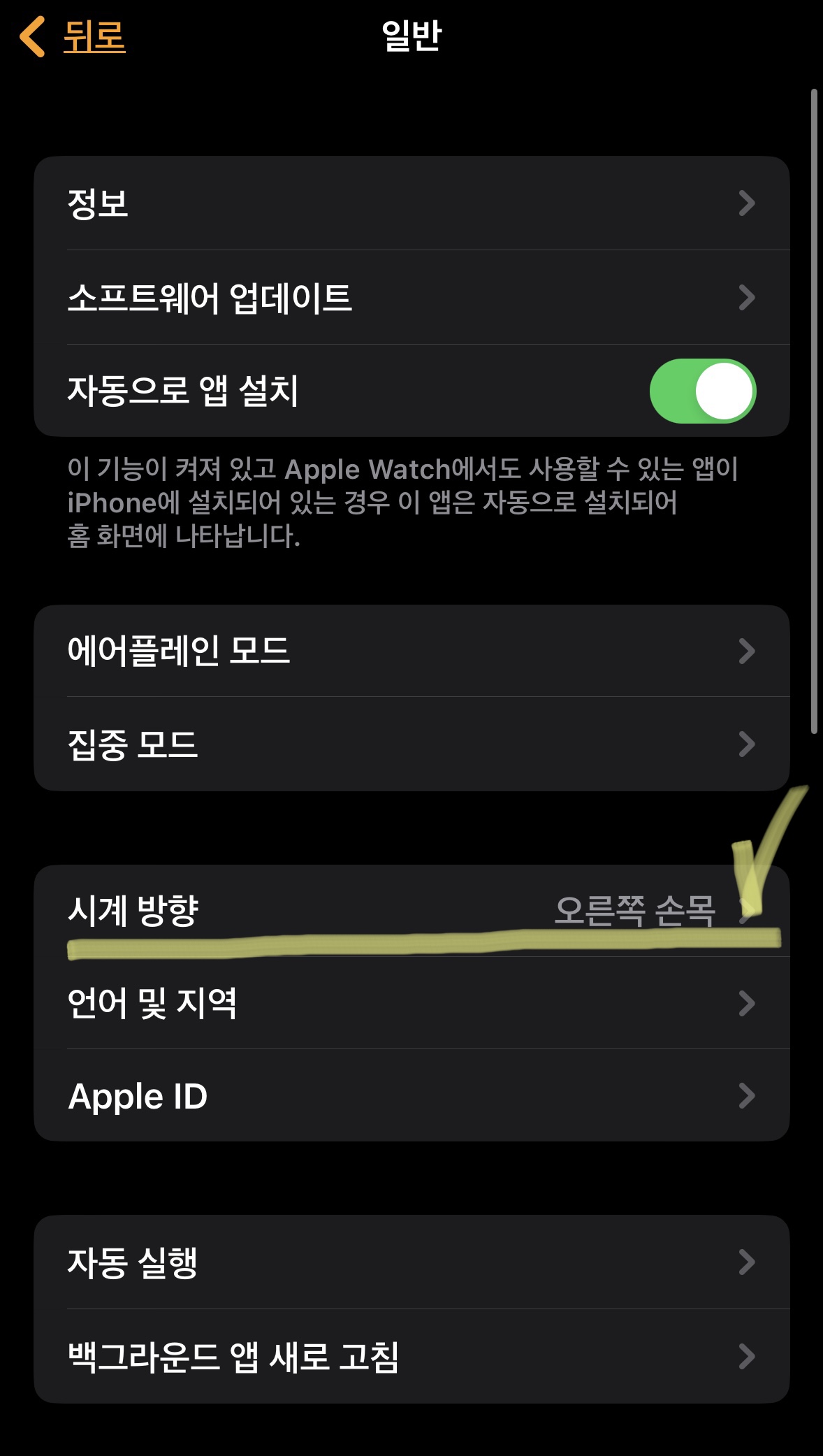 휴대폰 워치 기본 앱에서 → 일반 → 시계방향 → '오른쪽 손목'으로 수정