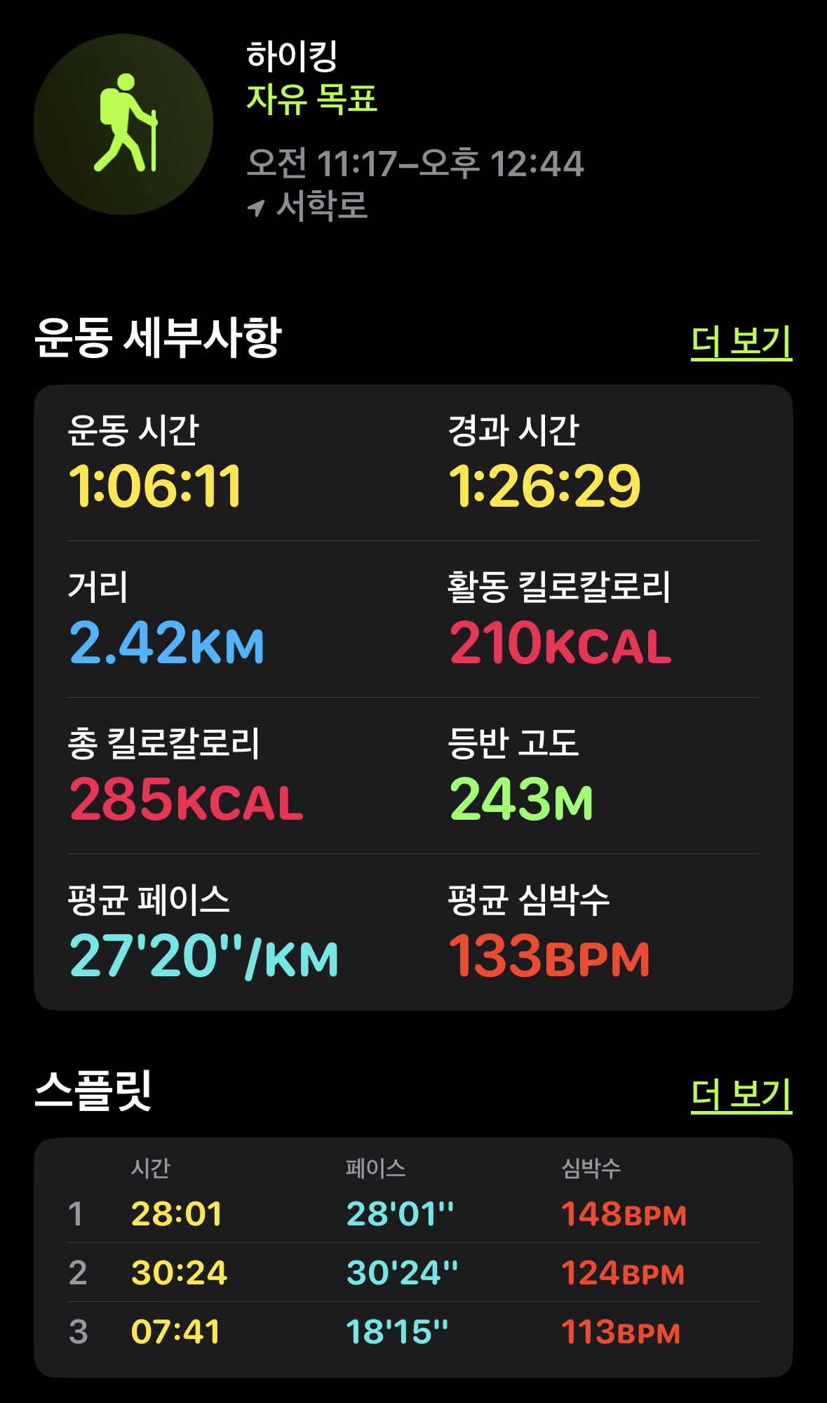 숨 찬 구간에 보여야 하는 빨간색도 많지 않은 기록. 쉬는 시간 빼고 3시간40분 정도 걸렸다.